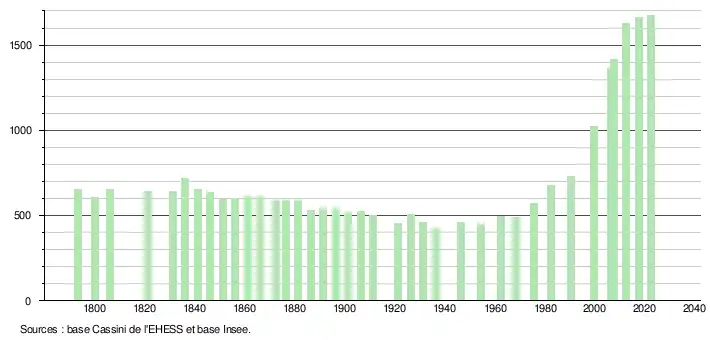 L'évolution du nombre d'habitants est connue à travers les recensements de la population effectués dans la commune depuis 1793. Pour les communes de moins de 10 000 habitants, une enquête de recensement portant sur toute la population est réalisée tous les cinq ans, les populations de référence des années intermédiaires étant quant à elles estimées par interpolation ou extrapolation[20]. Pour la commune, le premier recensement exhaustif entrant dans le cadre du nouveau dispositif a été réalisé en 2007[21].