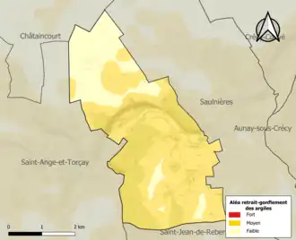 Le retrait-gonflement des sols argileux est susceptible d'engendrer des dommages importants aux bâtiments en cas d’alternance de périodes de sécheresse et de pluie. 75,5 % de la superficie communale est en aléa moyen ou fort (52,8 % au niveau départemental et 48,5 % au niveau national). Sur les 124 bâtiments dénombrés sur la commune en 2019, 75 sont en aléa moyen ou fort, soit 60 %, à comparer aux 70 % au niveau départemental et 54 % au niveau national. Une cartographie de l'exposition du territoire national au retrait gonflement des sols argileux est disponible sur le site du BRGM[18],[Carte 2].