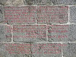 - Suivant la légende, Saint-Quay venant d'Irlande dans une auge en pierre, sans voile, sans avirons, sans vivres, débarqua miraculeusement sur la grève toute proche. A bout de forces, il put se traîner jusqu'ici.