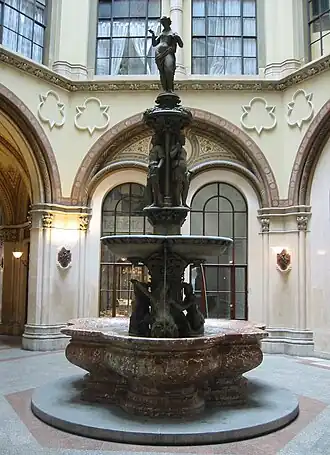 Trois sirènes émergent de l'eau du bassin de marbre, se serrent la main et dansent autour de la colonne dépassant du centre du bassin. Au-dessus d'elles se trouve un autre bassin d'eau plus petit, soutenu par des vrilles et trois oiseaux aquatiques qui servent de gargouilles. Il y a trois personnages au-dessus de ce bassin : un marchand, un constructeur naval et un pêcheur.