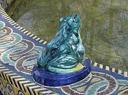 Huit grenouilles en céramique de couleur bleu turquoise sont placées sur la bordure du bassin. En son centre un canard blanc se tient sur une tortue à carapace verte. Les bouches des grenouilles et le bec du canard crachent de l'eau.