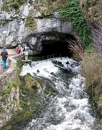 - un réservoir amont (une salle souterraine creusée par l'eau dans la masse calcaire), alimenté par l'eau provenant du bassin versant ;