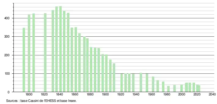 L'évolution du nombre d'habitants est connue à travers les recensements de la population effectués dans la commune depuis 1793. Pour les communes de moins de 10 000 habitants, une enquête de recensement portant sur toute la population est réalisée tous les cinq ans, les populations de référence des années intermédiaires étant quant à elles estimées par interpolation ou extrapolation[18]. Pour la commune, le premier recensement exhaustif entrant dans le cadre du nouveau dispositif a été réalisé en 2005[19].