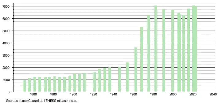 L'évolution du nombre d'habitants est connue à travers les recensements de la population effectués dans la commune depuis 1851. Pour les communes de moins de 10 000 habitants, une enquête de recensement portant sur toute la population est réalisée tous les cinq ans, les populations de référence des années intermédiaires étant quant à elles estimées par interpolation ou extrapolation[17]. Pour la commune, le premier recensement exhaustif entrant dans le cadre du nouveau dispositif a été réalisé en 2005[18].