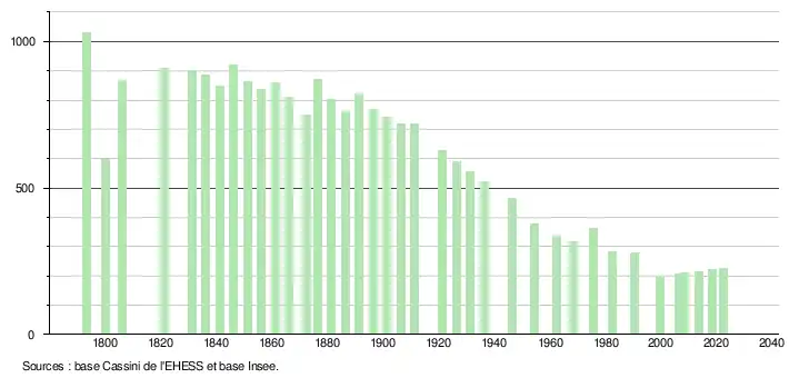 L'évolution du nombre d'habitants est connue à travers les recensements de la population effectués dans la commune depuis 1793. Pour les communes de moins de 10 000 habitants, une enquête de recensement portant sur toute la population est réalisée tous les cinq ans, les populations de référence des années intermédiaires étant quant à elles estimées par interpolation ou extrapolation[25]. Pour la commune, le premier recensement exhaustif entrant dans le cadre du nouveau dispositif a été réalisé en 2008[26].