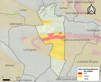 La commune est vulnérable au risque de mouvements de terrains constitué principalement du retrait-gonflement des sols argileux[20]. Cet aléa est susceptible d'engendrer des dommages importants aux bâtiments en cas d’alternance de périodes de sécheresse et de pluie. 40,8 % de la superficie communale est en aléa moyen ou fort (67,5 % au niveau départemental et 48,5 % au niveau national). Sur les 165 bâtiments dénombrés sur la commune en 2019, 164 sont en aléa moyen ou fort, soit 99 %, à comparer aux 90 % au niveau départemental et 54 % au niveau national. Une cartographie de l'exposition du territoire national au retrait gonflement des sols argileux est disponible sur le site du BRGM[21],[Carte 2].