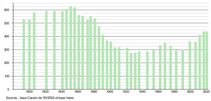 L'évolution du nombre d'habitants est connue à travers les recensements de la population effectués dans la commune depuis 1793. Pour les communes de moins de 10 000 habitants, une enquête de recensement portant sur toute la population est réalisée tous les cinq ans, les populations de référence des années intermédiaires étant quant à elles estimées par interpolation ou extrapolation[34]. Pour la commune, le premier recensement exhaustif entrant dans le cadre du nouveau dispositif a été réalisé en 2006[35].