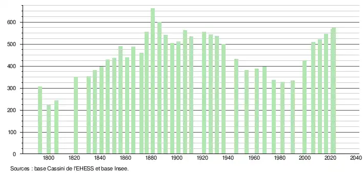 L'évolution du nombre d'habitants est connue à travers les recensements de la population effectués dans la commune depuis 1793. Pour les communes de moins de 10 000 habitants, une enquête de recensement portant sur toute la population est réalisée tous les cinq ans, les populations de référence des années intermédiaires étant quant à elles estimées par interpolation ou extrapolation[31]. Pour la commune, le premier recensement exhaustif entrant dans le cadre du nouveau dispositif a été réalisé en 2006[32].