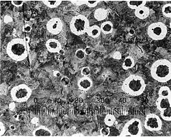 - les fontes à matrice perlitique : plus fréquentes, elles sont souvent incomplètes avec la formation d'une auréole de ferrite autour du graphite (ce qu'on appelle une structure "œil de bœuf")[1].