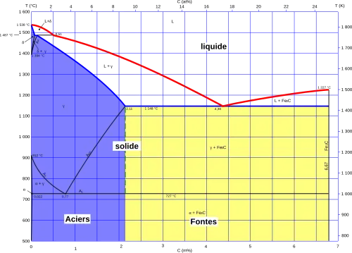 Les aciers cristallisent dans le diagramme fer-carbone métastable fer-cémentite (représenté ci-contre), bien que ce soit le graphite qui soit thermodynamiquement stable : la cémentite devrait se décomposer en