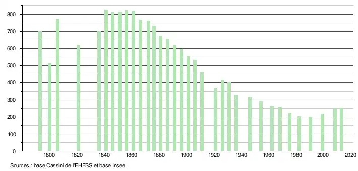 - ↑ Dans le tableau des recensements et le graphique, par convention dans Wikipédia, le principe a été retenu, pour les populations légales postérieures à 1999 de n’afficher dans le tableau des recensements et le graphique que les populations correspondant à l'année 2006, première population légale publiée calculée conformément aux concepts définis dans le décret no 2003-485 du 5 juin 2003, et les années correspondant à une enquête exhaustive de recensement pour les communes de moins de 10 000 habitants, ainsi que la dernière population légale publiée par l’Insee.