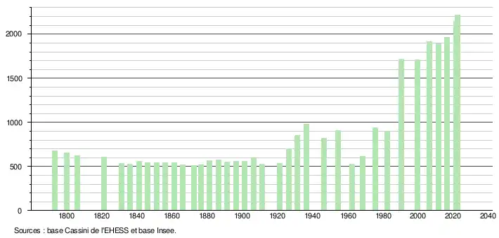 L'évolution du nombre d'habitants est connue à travers les recensements de la population effectués dans la commune depuis 1793. Pour les communes de moins de 10 000 habitants, une enquête de recensement portant sur toute la population est réalisée tous les cinq ans, les populations de référence des années intermédiaires étant quant à elles estimées par interpolation ou extrapolation[24]. Pour la commune, le premier recensement exhaustif entrant dans le cadre du nouveau dispositif a été réalisé en 2006[25].