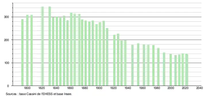 L'évolution du nombre d'habitants est connue à travers les recensements de la population effectués dans la commune depuis 1793. Pour les communes de moins de 10 000 habitants, une enquête de recensement portant sur toute la population est réalisée tous les cinq ans, les populations de référence des années intermédiaires étant quant à elles estimées par interpolation ou extrapolation[14]. Pour la commune, le premier recensement exhaustif entrant dans le cadre du nouveau dispositif a été réalisé en 2006[15].