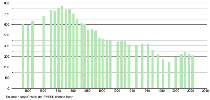 L'évolution du nombre d'habitants est connue à travers les recensements de la population effectués dans la commune depuis 1793. Pour les communes de moins de 10 000 habitants, une enquête de recensement portant sur toute la population est réalisée tous les cinq ans, les populations de référence des années intermédiaires étant quant à elles estimées par interpolation ou extrapolation[15]. Pour la commune, le premier recensement exhaustif entrant dans le cadre du nouveau dispositif a été réalisé en 2007[16].
