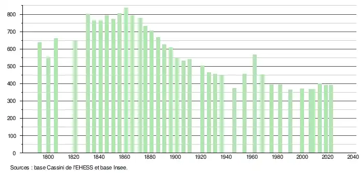 L'évolution du nombre d'habitants est connue à travers les recensements de la population effectués dans la commune depuis 1793. Pour les communes de moins de 10 000 habitants, une enquête de recensement portant sur toute la population est réalisée tous les cinq ans, les populations de référence des années intermédiaires étant quant à elles estimées par interpolation ou extrapolation[8]. Pour la commune, le premier recensement exhaustif entrant dans le cadre du nouveau dispositif a été réalisé en 2008[9].