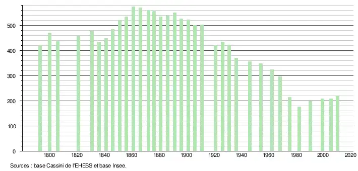 - ↑ Par convention dans Wikipédia, le principe a été retenu de n’afficher dans le tableau des recensements et le graphique, pour les populations légales postérieures à 1999, que les populations correspondant à une enquête exhaustive de recensement pour les communes de moins de 10 000 habitants, et que les populations des années 2006, 2011, 2016, etc. pour les communes de plus de 10 000 habitants, ainsi que la dernière population légale publiée par l’Insee pour l'ensemble des communes.