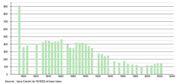 L'évolution du nombre d'habitants est connue à travers les recensements de la population effectués dans la commune depuis 1793. Pour les communes de moins de 10 000 habitants, une enquête de recensement portant sur toute la population est réalisée tous les cinq ans, les populations de référence des années intermédiaires étant quant à elles estimées par interpolation ou extrapolation[14]. Pour la commune, le premier recensement exhaustif entrant dans le cadre du nouveau dispositif a été réalisé en 2006[15].