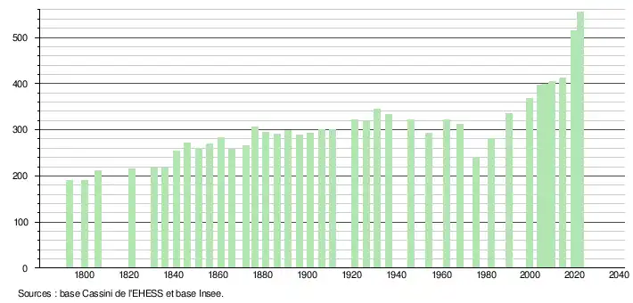 L'évolution du nombre d'habitants est connue à travers les recensements de la population effectués dans la commune depuis 1793. Pour les communes de moins de 10 000 habitants, une enquête de recensement portant sur toute la population est réalisée tous les cinq ans, les populations de référence des années intermédiaires étant quant à elles estimées par interpolation ou extrapolation[32]. Pour la commune, le premier recensement exhaustif entrant dans le cadre du nouveau dispositif a été réalisé en 2004[33].