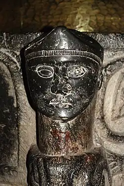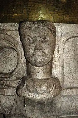 Deux de ces têtes sont sculptées dans une pierre noire et deux dans une pierre plus claire.