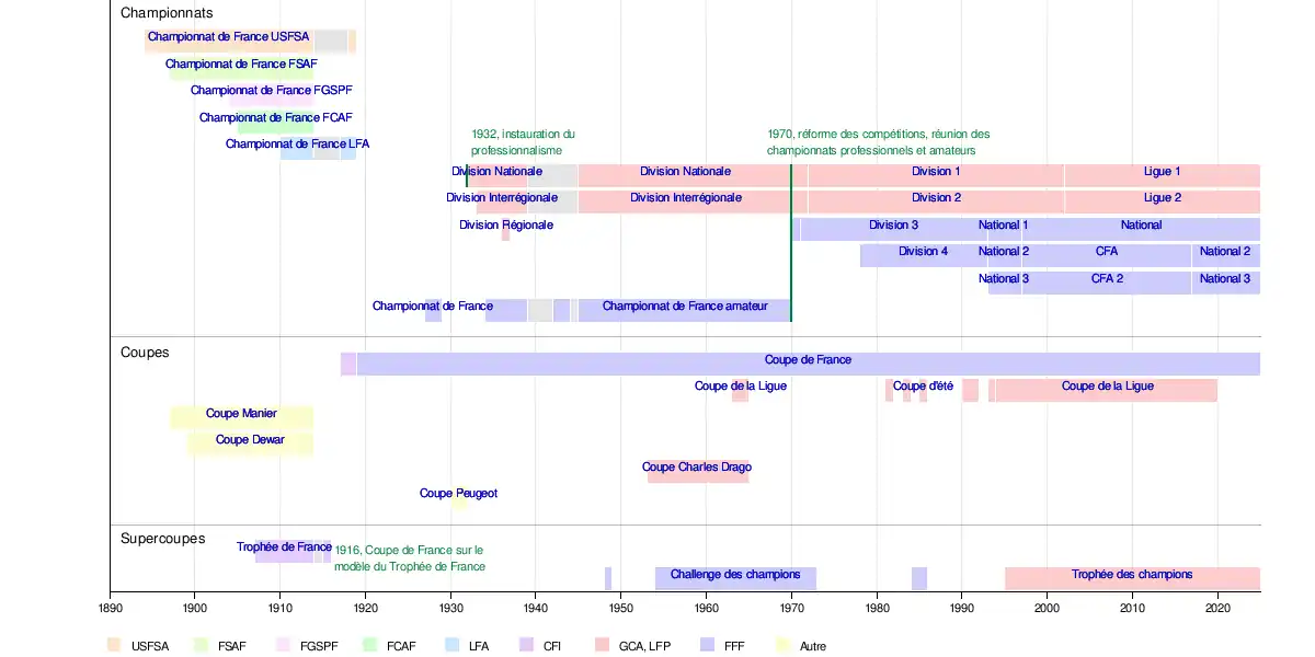 La frise chronologique suivante présente l'historique des compétitions de football à envergure nationale disputées depuis 1894. Chaque couleur correspond à la fédération organisatrice de l'épreuve.