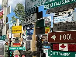 La forêt de panneaux de signalisation occupe plusieurs hectares et de nouveaux panneaux sont ajoutés en permanence. Il y a des panneaux de rue, des panneaux de bienvenue, des signatures sur les assiettes à dîner et des plaques d'immatriculation du monde entier.