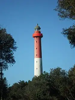 Monument emblématique de ce vaste ensemble, le phare de la Coubre est situé sur la pointe du même nom, à proximité de Bonne Anse. Construit à partir de 1904 afin de remplacer un précédent édifice rongé par la mer (et qui finira par s'écrouler en 1907), il toise toute la région du haut de ses 64 mètres, qui en font le plus haut phare du département et un des plus puissants de la côte atlantique (sa portée est de 28 milles marins[26]). Du haut de la plate-forme sommitale, la vue porte à près de 50 kilomètres à la ronde[27] : Royan, Marennes, l'île d'Oléron, le phare de Cordouan, les côtes du Médoc et les prémices de la côte d'Argent peuvent être aperçus sans difficulté par temps clair.