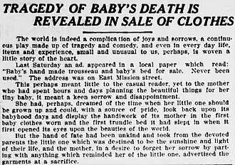 16 mai 1910, The Spokane Press relate la mort d'un bébé à travers la vente de ses vêtements.