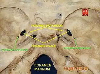 - ↑ « Postnatal enlargement of the foramina rotundum, ovale et spinosum and their topographical changes », Anatomischer Anzeiger, vol. 156, no 5, , p. 351–87 (PMID 6486466)
