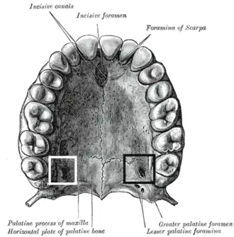 - ↑ Akram Abood Jaffar, « Anatomical variations – Greater palatine foramen » [archive du ]