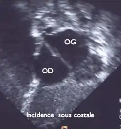 - Chez le nouveau-né et le nourrisson, le diagnostic de FOP est relativement simple. Sa présence est souvent soupçonnée en échographie bi-dimensionnelle par la constatation d'un discret défect entre deux portions du septum inter-auriculaire se recouvrant partiellement, à la façon des tuiles sur un toit. Elle est affirmée par la mise en évidence d'un shunt gauche-droit à l'examen doppler couleur. Celui-ci est habituellement minime et sans conséquence.
