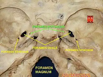 - ↑ Yanagi S, « Developmental studies on the foramen rotundum, foramen ovale and foramen spinosum of the human sphenoid bone », The Hokkaido Journal of Medical Science, vol. 62, no 3, , p. 485–96 (PMID 3610040)