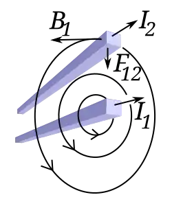 Formule où kA est la constante de force magnétique de la loi de Biot et Savart, Fm/L est la force par unité de longueur, d est la distance entre les deux fils, et I1, I2 sont les courants continus porté par les fils.