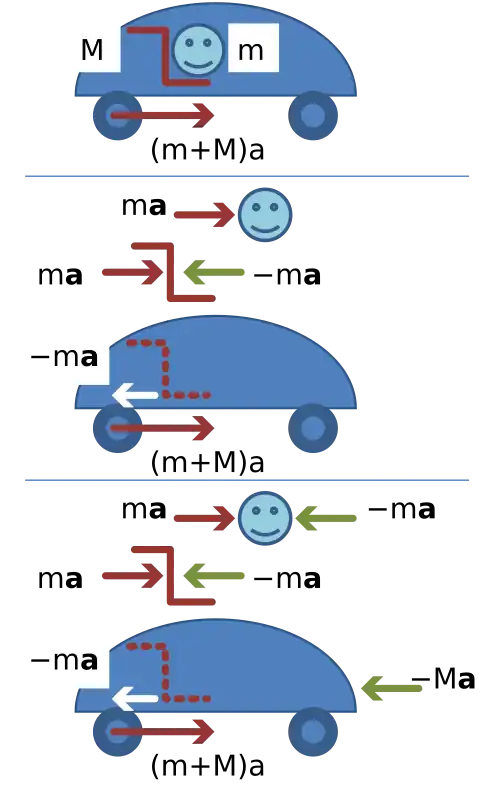 - la figure du milieu représente le même point de vue, mais en considérant séparément la voiture, le siège (supposé de masse négligeable) et le conducteur. Ce dernier est accéléré par une force ma en provenance du siège, alors que la voiture reçoit une force (m+M)a de la chaussée et −ma du siège ;