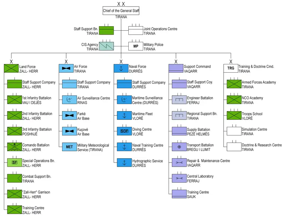 Le , la nouvelle structure des forces armées albanaises est officialisée par le président de la république. Elle est basée sur le concept de commandements conjoints au nombre de trois. Le commandement conjoint des forces albanaises inclut la brigade de réaction rapide (une brigade d'infanterie mécanisée), le régiment des forces spéciales, la brigade maritime, la brigade aérienne et la brigade de soutien territoriale. Le Support Command fournit un soutien logistique pour toutes les unités et le commandement pour l'entraînement et la doctrine est l'unité de formation principale des forces armées albanaises.