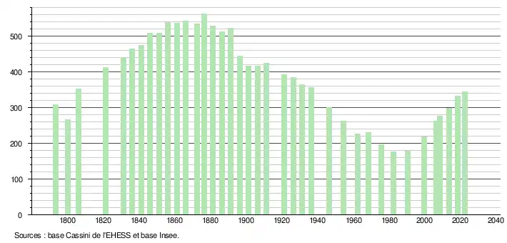 L'évolution du nombre d'habitants est connue à travers les recensements de la population effectués dans la commune depuis 1793. Pour les communes de moins de 10 000 habitants, une enquête de recensement portant sur toute la population est réalisée tous les cinq ans, les populations de référence des années intermédiaires étant quant à elles estimées par interpolation ou extrapolation[16]. Pour la commune, le premier recensement exhaustif entrant dans le cadre du nouveau dispositif a été réalisé en 2008[17].