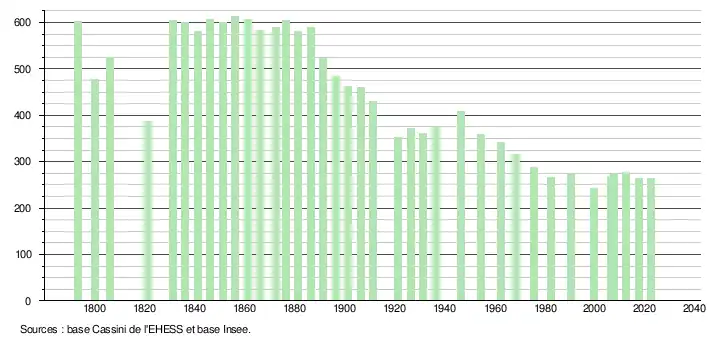 L'évolution du nombre d'habitants est connue à travers les recensements de la population effectués dans la commune depuis 1793. Pour les communes de moins de 10 000 habitants, une enquête de recensement portant sur toute la population est réalisée tous les cinq ans, les populations de référence des années intermédiaires étant quant à elles estimées par interpolation ou extrapolation[24]. Pour la commune, le premier recensement exhaustif entrant dans le cadre du nouveau dispositif a été réalisé en 2007[25].