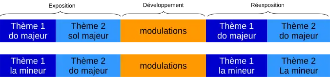 - Thème A (en bleu foncé dans l'illustration du haut), dans la tonalité principale, puis transition (pont) vers la tonalité de la dominante (dans le cas d'une tonalité principale majeure ex : do majeur - sol majeur) ou du majeur relatif (dans le cas d'une tonalité principale mineure ex : do mineur - mi bémol majeur);