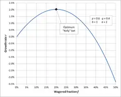 À titre d'exemple, si un pari offre 60 % de chance de gagner la mise (p = 0,60, q = 0,40, b = 1), alors le joueur doit miser 20 % de son budget à chaque opportunité (f * = 0,20), afin de maximiser les taux à long terme de croissance de son capital.
