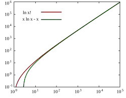 Dans le cadre de la thermodynamique statistique (distribution de Boltzmann) il est commode de considérer le logarithme népérien d'une factorielle en faisant l'approximation de Stirling[9]. L'approximation consiste à assimiler la somme à une intégrale quand n est suffisamment grand[10].