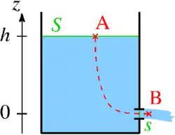 - la surface s du trou soit négligeable devant la surface libre S du liquide ; la conservation du débit impose que , d'où ; on peut donc considérer que la hauteur h ne varie pas au cours du temps, et que l'écoulement du liquide est permanent.