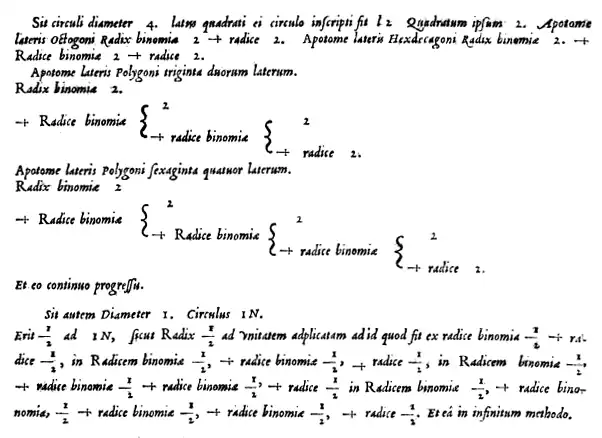 où , avec [9]. Le concept de limite et les preuves rigoureuses de convergence ont été développés en mathématiques bien après l'œuvre de Viète ; la première preuve que cette limite existe n'a été donnée qu'en 1891, par Ferdinand Rudio[10].