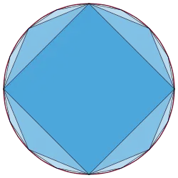 Viète a obtenu sa formule en comparant les aires des polygones réguliers avec 2n et 2n + 1 côtés inscrits dans un cercle. Le premier terme du produit, , est le rapport des aires d'un carré et d'un octogone, le deuxième terme est le rapport des aires d'un octogone et un hexadécagone, etc. Ainsi, le produit se télescope pour donner le rapport des aires d'un carré à un cercle. Les facteurs du produit peuvent aussi être interprétés comme des rapports de périmètres de la même suite de polygones, en commençant par le rapport des périmètres d'un digone (le diamètre du cercle, compté deux fois) et d'un carré, le rapport des périmètres d'un carré et d'un octogone, etc[22].