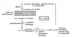 Conventionnellement, le cycle part d'un neutron rapide émis lors d'une fission induite par la capture[Note 1] d'un neutron thermique (par exemple par un noyau d'U235). Le facteur est ainsi un facteur correctif qui permet de tenir compte du fait que des neutrons sont également émis à la suite de fissions induites par la capture d'un neutron rapide. | |