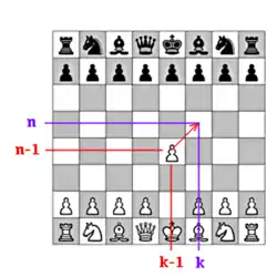 Cette relation est dénommée « formule du pion »[1] du fait de l'analogie entre sa situation dans le triangle de Pascal et le mouvement d'un pion dans le jeu d'échecs. En effet, lorsqu’un pion attaque un pion adverse, il se déplace d’une case en diagonale (par exemple depuis la case située à l’intersection de la ligne n – 1 et de la colonne k – 1 vers celle située à l’intersection de la ligne n et de la colonne k).