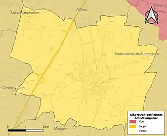 Les mouvements de terrains susceptibles de se produire sur la commune sont des tassements différentiels[16]. Le retrait-gonflement des sols argileux est susceptible d'engendrer des dommages importants aux bâtiments en cas d’alternance de périodes de sécheresse et de pluie[17]. La totalité de la commune est en aléa moyen ou fort (54,9 % au niveau départemental et 48,5 % au niveau national)[Carte 2]. Depuis le , en application de la loi ELAN, différentes contraintes s'imposent aux vendeurs, maîtres d'ouvrages ou constructeurs de biens situés dans une zone classée en aléa moyen ou fort[Note 2],[18].