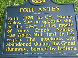Le fort a été construit sous la direction du colonel Antes, qui était membre de la milice pennsylvanienne. Il se trouvait sur la rive Est du ruisseau d'Antes, surplombant sur sa rive gauche la branche Ouest de la Susquehanna, sur un plateau de la commune de Nippenose, au sud de l'actuelle ville de Jersey Shore, dans la partie occidentale du comté de Lycoming. La milice locale a tenu le fort pendant un court laps de temps jusqu'à ce qu'il a été ordonné d'abandonner le fort Antes au cours du Big Runaway (« Grande Fuite ») par le colonel Samuel Hunter. Bien qu'abandonné et que les forces anglaises aient essayé, par deux fois, de le brûler, le Fort Antes a été l'une des deux seules constructions de la vallée à subsister après le Big Runaway.