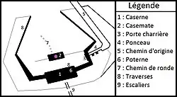 - ↑ Traverse : passage protégé par deux murs épais de chaque côté, ou enterré pour former un tunnel court.