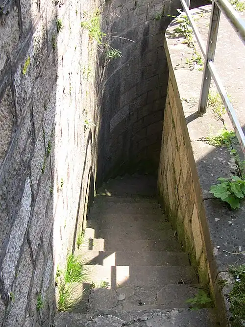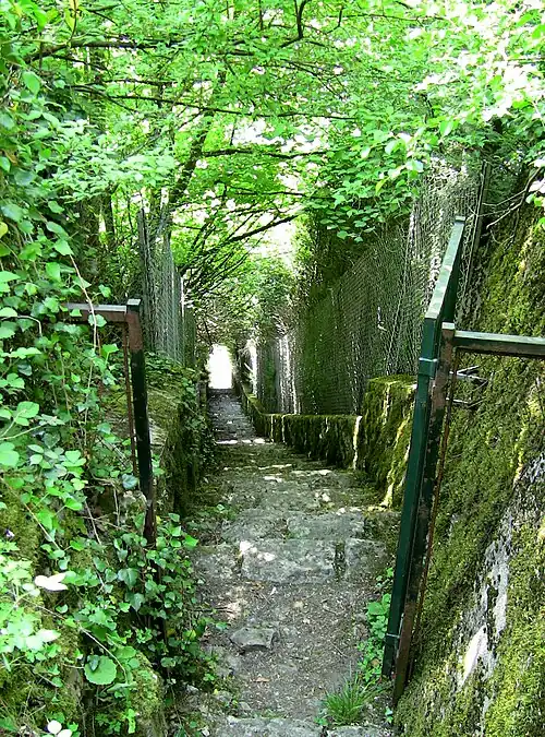 - ↑ Visite du monument : En suivant ce parcours : aller jusqu'au panorama, descendre au niveau du casernement, continuer jusqu'à la porte charretière, longer la passerelle, puis faire demi tour jusqu'à la caserne ; descendre par la poterne, prendre à gauche (direction sud) et accéder aux piles du ponceau, faire demi tour (direction nord) et prendre le premier petit escalier pour voir le second escalier qui mène au Doubs (mais ne pas prendre celui-ci), et enfin continuer tout droit le long des remparts ouest et nord.