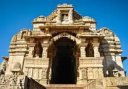 Le fort, qui a à peu près la forme d'un poisson, a une circonférence de 13 km avec une longueur maximale de 5 km et il couvre une superficie de 700 acres[38]. Le fort est accessible par une difficile ascension en zigzag de plus de 1 km depuis la plaine, après avoir traversé un pont en pierre calcaire. Le pont enjambe la rivière Gambhiri et est soutenu par dix arches (l'une a une forme incurvée tandis que les autres ont des arcs en ogive). Outre les deux hautes tours, qui dominent les fortifications majestueuses, le fort tentaculaire possède une pléthore de palais et de temples (dont beaucoup en ruines) dans son enceinte[39],[3].
