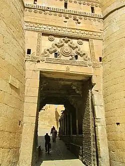 Suarj Pol, l'une des portes d'entrée du fort de Jaisalmer Quatre portes massives par lesquelles les visiteurs du fort doivent passer, situées le long de l'approche principale de la citadelle.